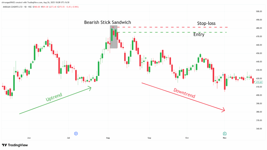 In the image below, you can look at the chart of “Ambuja Cements Ltd” stock at a 1-day timeframe from 3rd to 7th August 2023. You can spot the Bearish Stick Sandwich candlestick formed and signalling a sell, as it is a trend reversal.