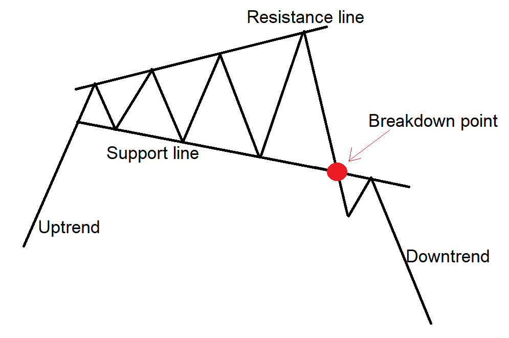 Two trendlines are drawn connecting the higher high and the lower lows, forming a widening triangle or inverted symmetrical triangle.