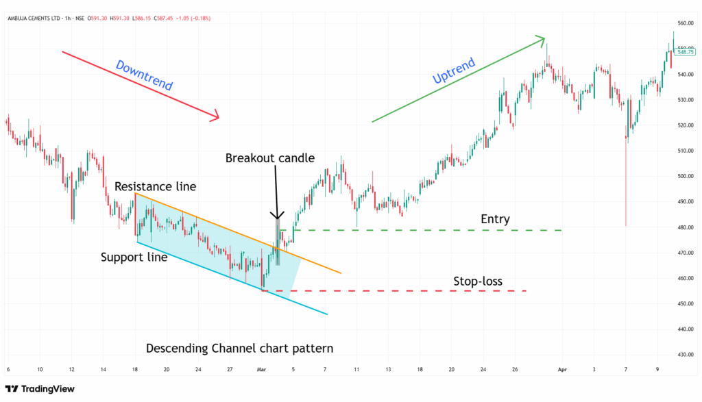 The chart below shows an example of “ Ambuja Cements Ltd” stock at a 1-hour timeframe from 18th February to 4th March 2025. You can see the buy signal generated by the Descending Channel chart pattern.