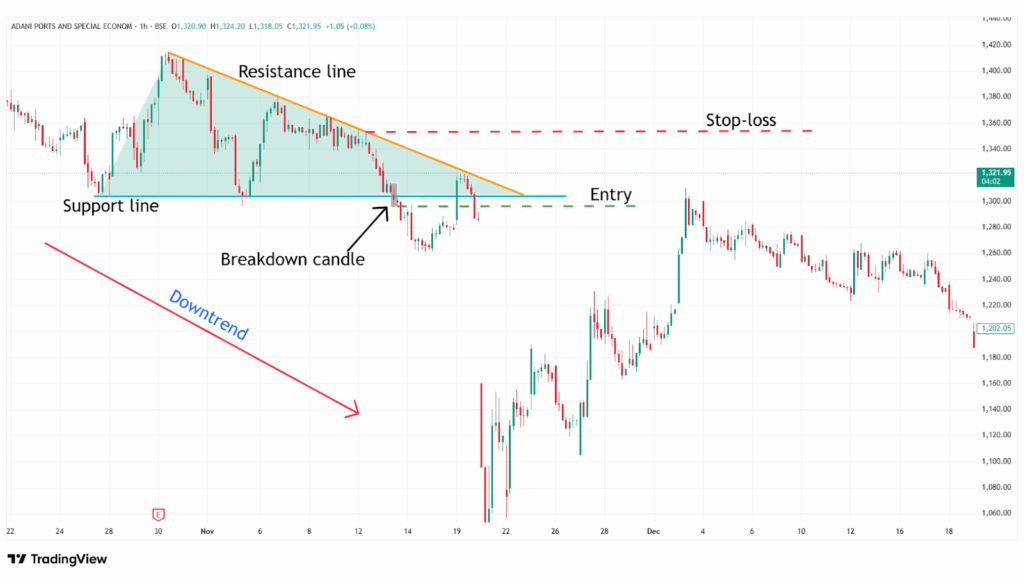 The chart below shows an example of “ Adani Ports Ltd” stock at a 1-hour timeframe from 25th October to 13th November 2024, and you can see the sell signal generated by the Descending Triangle.