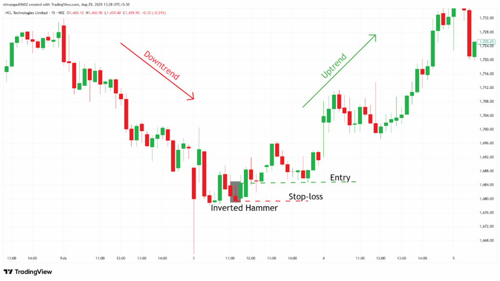 In the image below, you can look at the chart of “HCL Technologies Ltd” stock at a 15-minute timeframe on 3rd February 2025. You can see the buy signal generated using the Inverted Hammer candlestick pattern.